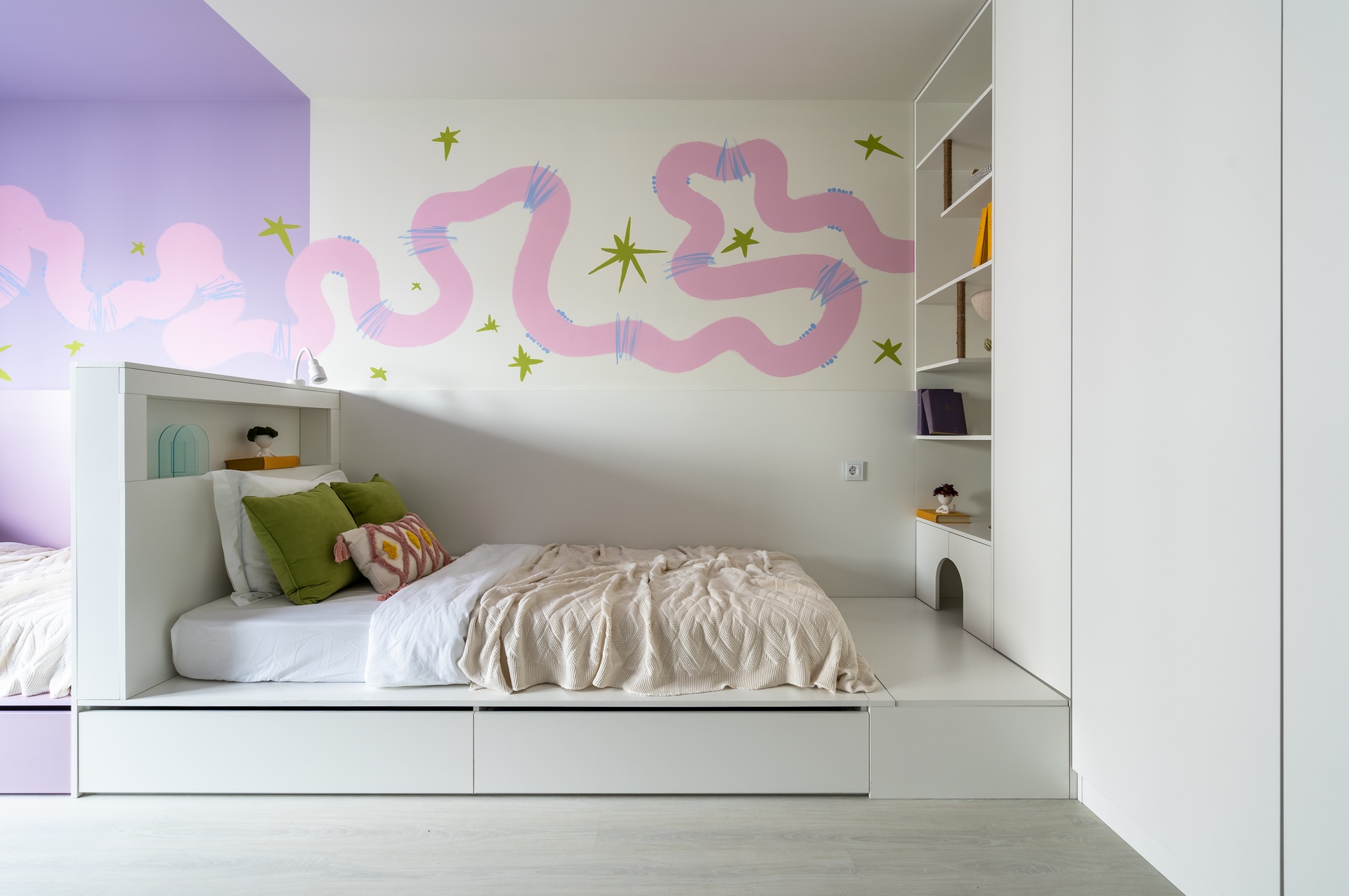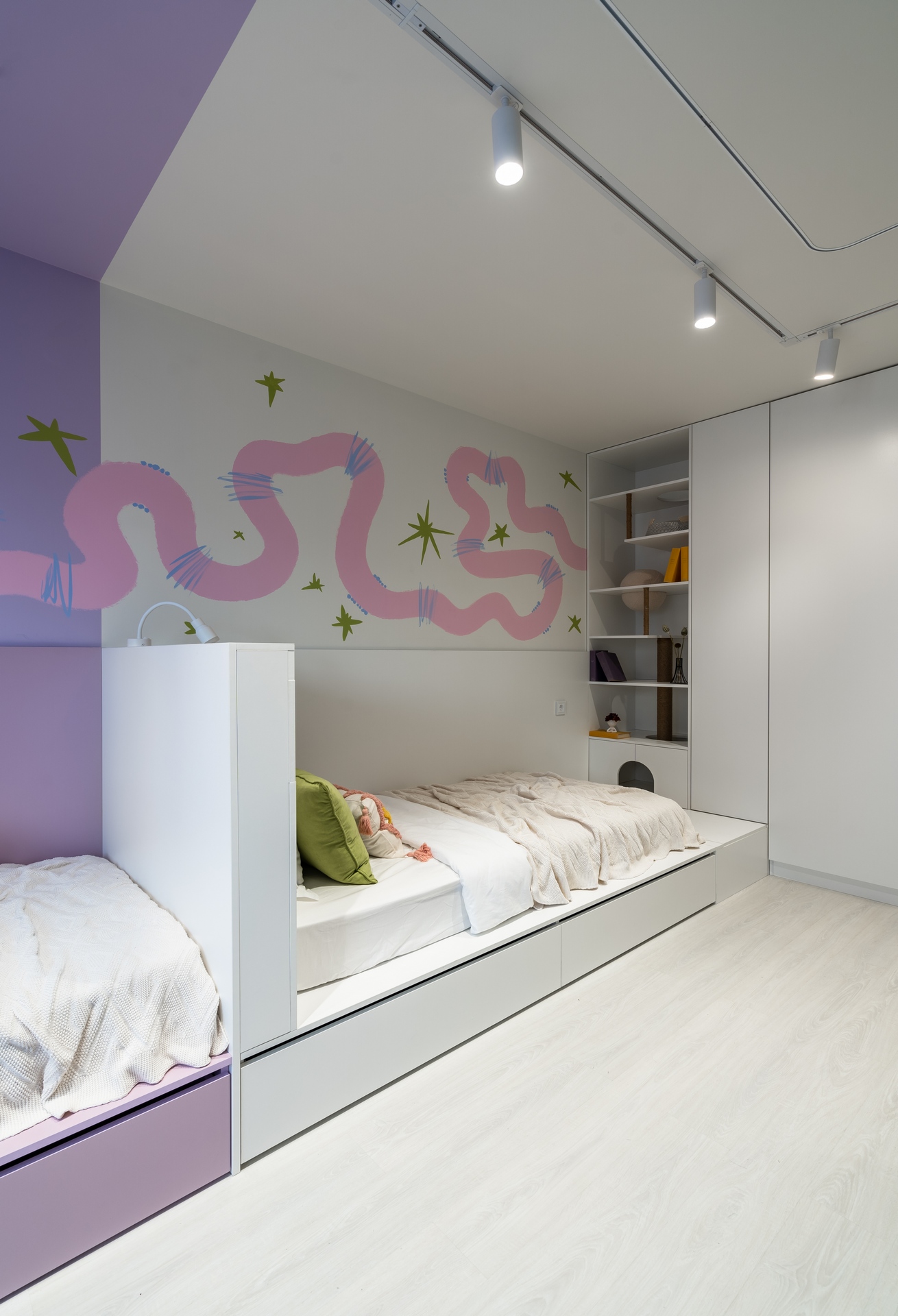 Эта детская родилась по острому запросу на разделение пространства. Дизайнеры «Квартирного вопроса» решили его нестандартным способом, и в новой детской теперь много воздуха, при этом у каждой из 3 сестёр есть своё пространство, а в центре комнаты появилось общее место для совместных игр.