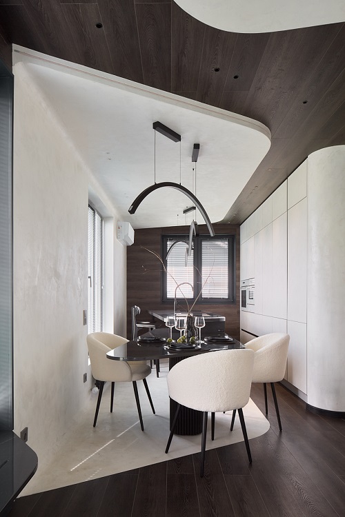 Дизайн-студия BALKA.Studio воссоздали на кухне героев выпуска атмосферу бизнес-класса самолета — получился эргономичный интерьер с обтекаемыми формами, высоким уровнем сервиса в зоне готовки и пространством для мягкой посадки в зоне отдыха.