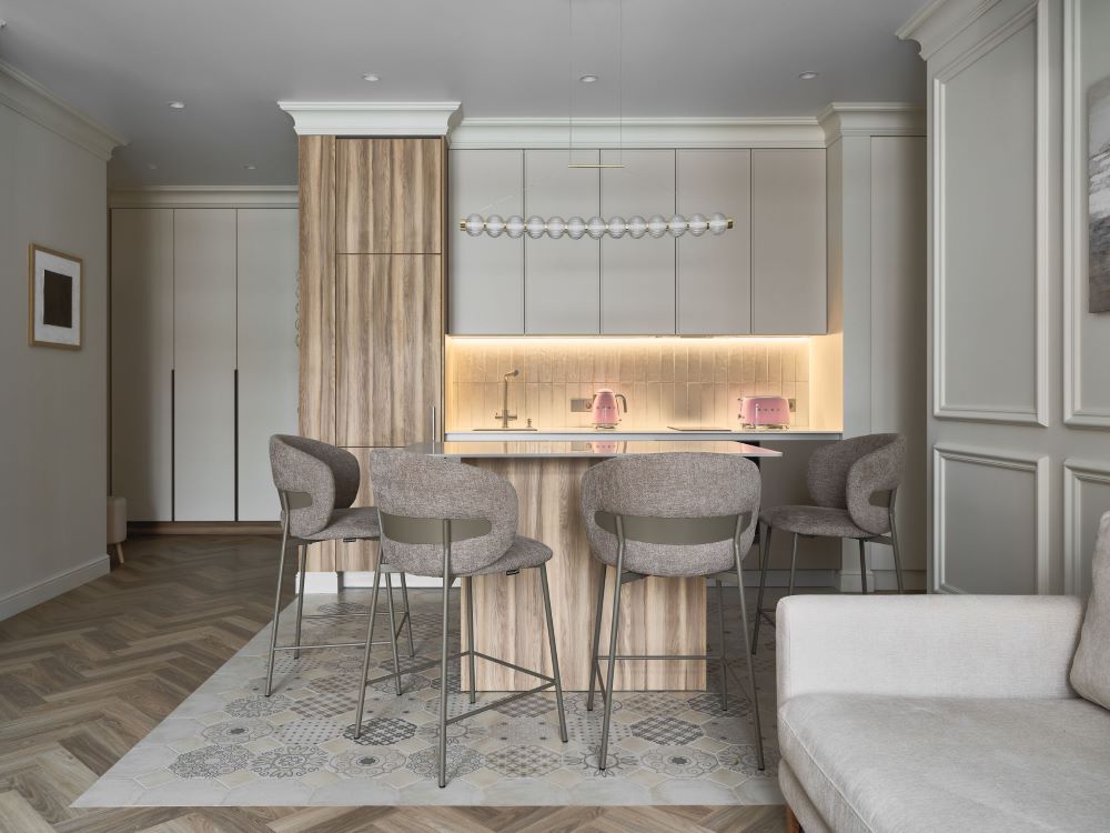Классика этого интерьера читается в деталях — филёнках на стенах, широких карнизах и спокойной симметрии. Пространство звучит современно и легко, как продуманная композиция без лишних нот. Акцентная стена в цвете хаки добавляет интерьеру глубину и гармонично объединяется с тёплым деревом в отделке.